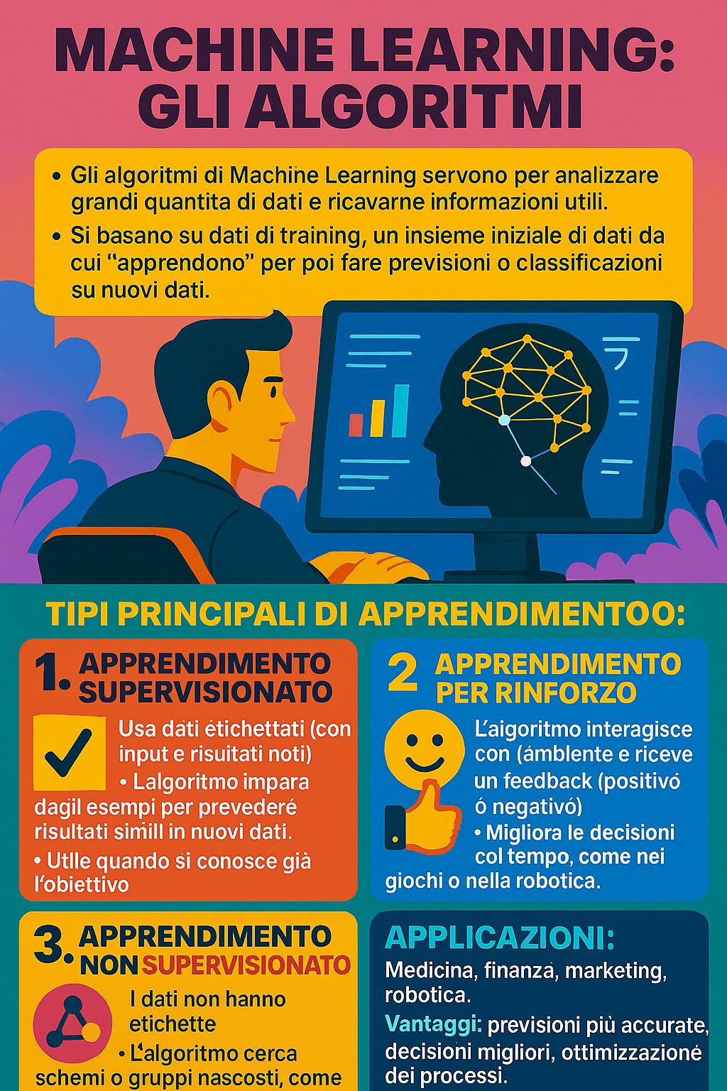 Esistono tre principali tipi di apprendimento. L’apprendimento supervisionato utilizza dati etichettati, ovvero con input e risultati già noti, e permette all’algoritmo di imparare da questi esempi per fare previsioni su casi simili. L’apprendimento per rinforzo, invece, si basa sull’interazione dell’algoritmo con un ambiente: il sistema riceve un feedback positivo o negativo in base alle sue azioni e, col tempo, migliora le proprie decisioni, come accade nei giochi o nella robotica. Infine, l’apprendimento non supervisionato lavora su dati privi di etichette, cercando autonomamente schemi o gruppi nascosti, ad esempio attraverso il clustering.